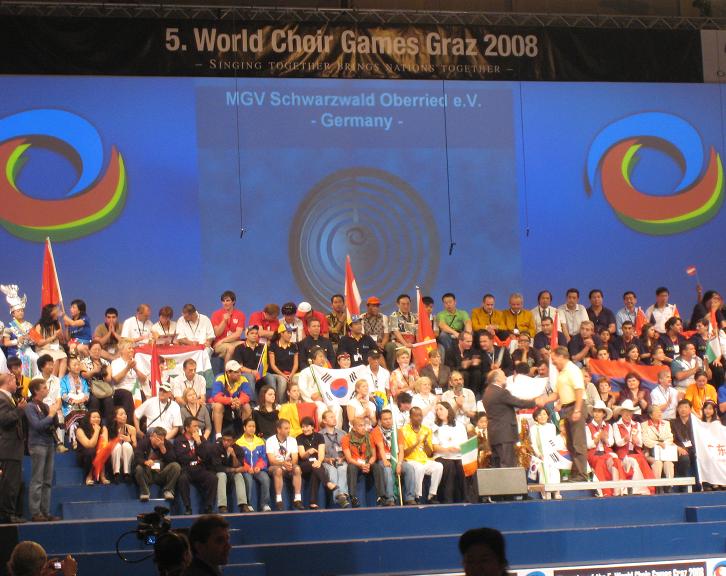 An den 5. World Choir Games 2008 in Österreichs Kulturhauptstadt Graz nahmen rund 20.000 Sängerinnen und Sänger aus 93 Nationen teil. 441 Chöre waren in über 600 Wettbewerbsauftritten und fast ebenso vielen Gala- und Begegnungskonzerten zu hören. Mit jeweils einem Silber-Diplom bei den Männer-Vokalensembles und Männer-Kammerchören zählten die "Ohrwürmer" und der MGV "Schwarzwald" Oberried zu den erfolgreichsten deutschen Teilnehmern dieser Kategorien. |