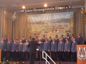 100 Jahre Gesangverein EbnetDie Chorgemeinschaft Dreisamtal war zum Jubiläum des Gesangverein Ebnet erschienen. Da durften auch wir nicht fehlen. Mit knapp 30 Sängern standen wir auf der Bühne und gaben mit drei Liedbeiträgen einen Eindruck von unserem Repertoire: "Schwinge Dich auf“, "Kad si Bila Mala Mare“ und "Funiculi" wurden kraftvoll dargeboten, natürlich ohne Text- und Notenblätter in den Händen aber mit vollem Kontakt zum Dirigenten Michael Weh. Sein zufriedener Blick sagte alles. Zum Abschluss standen alle Chöre mit einigen gemeinsamen Liedbeiträgen auf der Bühne. |