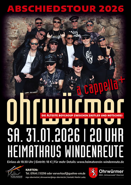 Das Heimathaus in Windenreute wird zum ersten mal von den Ohrwürmern betreten. Wir freuen uns auf diese neue Mögllichkeit uns zu präsentieren. Anbei noch der Flyer |
