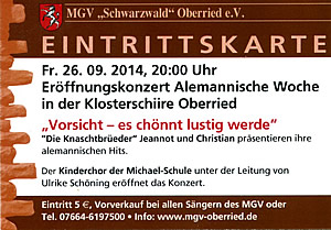 Eröffnungskonzert "Alemannische Woche"Da wir gerade vor ausverkaufter Klosterscheune ein Spätsommerkonzert gaben, haben wir zur Eröffnung der Alemannischen Woche den "Knaschtbrüdern" den Vortritt gelassen. Herzlichen Dank auch an Frau Schöning und dem Kinderchor der Grundschule Oberried für ihren schönen Auftritt zu Beginn der Vorstellung. |